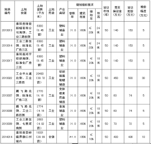 備注:1.2013013、2013014、2013017、2013022、2013037、2013038、2013039宗地位于產(chǎn)業(yè)集聚區(qū)內(nèi),屬兩層以上標(biāo)準(zhǔn)化廠房建設(shè)用地,投資強度≥3750萬元/公頃。地上有部分違法建筑物,經(jīng)政府辦、發(fā)改委、財政局、監(jiān)察局、法制辦、住建局、審計局、房產(chǎn)辦、規(guī)劃辦、城市綜合執(zhí)法局和縣產(chǎn)業(yè)集聚區(qū)管委會集體研究,地上建筑不再作價與土地捆綁出讓,由土地競得人無償處置地上建筑物。土地出讓合同簽訂后,8個月內(nèi)必須開工建設(shè),工期24個月,土地成交價款需在土地出讓合同簽訂后60日內(nèi)繳清,交地時間在3個月內(nèi)。
