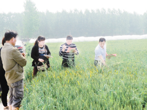 下圖:昨日,項城市農科所技術人員正在進行小麥雜交授粉。連日來,該所抓住小麥授粉期的晴好天氣,組織技術人員開展雜交授粉實驗,確保小麥單產同步提高。(蔣樹保 攝)