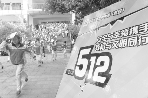 校園地震逃生演練    5月12日,安徽省合肥市蜀山區(qū)第五十中學(新區(qū))的學生們在演練地震逃生撤離。當日是“5·12”汶川地震紀念日,該校開展逃生演練?;顒又荚谥笇W生遇到地震時采用有序、正確的處置方法。