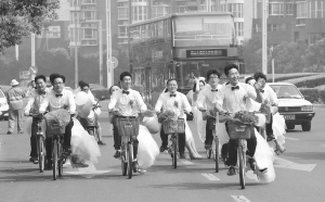 鄭州:騎著單車娶新娘 5月23日,新郎帶著新娘騎行在鄭東新區(qū)。 當(dāng)日,由鄭州晚報(bào)等單位主辦的“幸福相約”鄭州青年集體婚禮在鄭東新區(qū)舉行,共有16對新人參加?;槎Y上,新郎騎著自行車迎娶新娘,倡導(dǎo)低碳、簡約婚禮。新華社記者 趙鵬 攝