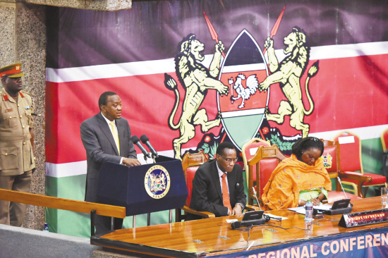 肯尼亞舉辦地區(qū)會議呼吁國際社會合作反恐   6月27日,在肯尼亞內(nèi)羅畢,肯尼亞總統(tǒng)肯雅塔(左)在地區(qū)會議上致閉幕辭??夏醽喺?5日至27日在首都內(nèi)羅畢舉辦地區(qū)會議,探討如何應(yīng)對暴力極端主義和恐怖活動,并呼吁國際社會合作反恐。(本欄文圖均據(jù)新華社發(fā))