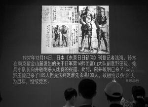 ?、?nbsp;7月12日,觀眾在中國人民抗日戰(zhàn)爭紀(jì)念館觀看1937年12月14日,日本《東京日日新聞》記者淺海、鈴木在南京紫金山麓發(fā)出的關(guān)于日軍第16師團(tuán)富山大隊(duì)副官野田毅、炮兵小隊(duì)長向井敏明殺人比賽的報(bào)道。